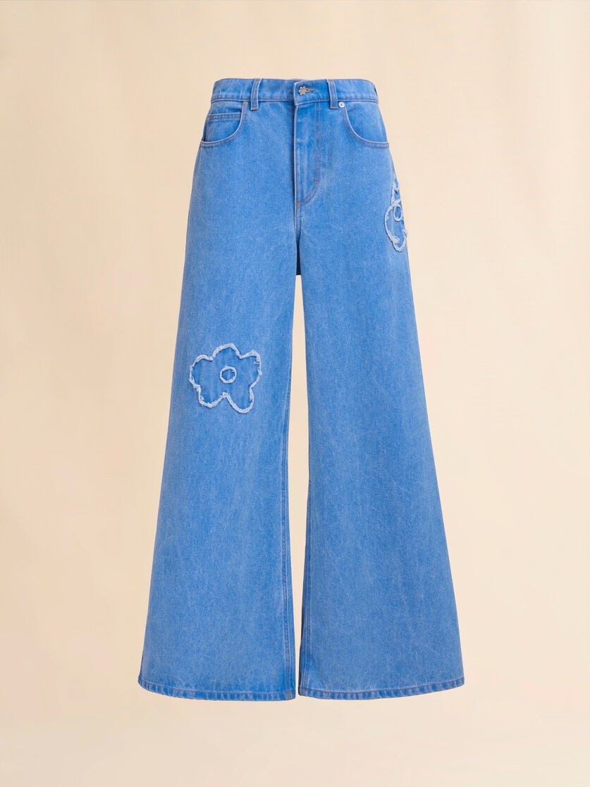 Jeans cúig phóca gearrtha as dénim cadáis orgánaigh nite, le paistí bláthanna Dillies gearrtha go neamhbhriste. Coim íseal agus crotch íseal le cos leathan. Lipéad leathair le lógó dearg Marni ar chúl an choim. Dúnadh zip agus cnaipe greamaitheach.