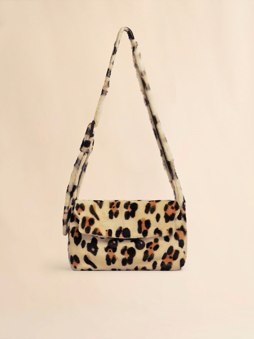 Mála gualainn bog Trunkaroo le prionta ainmhithe, déanta as fionnaidh lomtha. Méid meánach. Tá flapa tosaigh ar an gcruth dronuilleogach atá dúnta le clasp maighnéadach mór greanta le lógó Marni agus dhá leathsféar clúdaithe le leathar tonúil. Líneáil nappa le póca amháin. Strap leathair inchoigeartaithe le búcla tonúil.