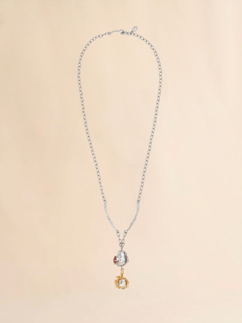 Muince slabhra fada Flower Delirium déanta as miotal. Mionsonraí agus crochadán neamhrialta le péarlaí, criostail agus rhinestones.