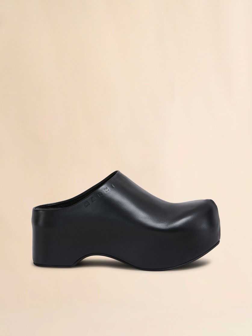 Sábóg mhór le bonn ardáin adhmaid éadrom, clúdaithe go hiomlán le leathar nappa snasta. Maisithe go caolchúiseach le litreacha Marni greanta feadh an imeall. Bonn istigh leathair agus bonn seachtrach rubair ribeach.