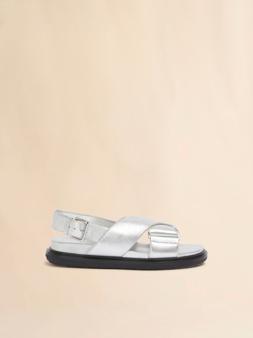 Sandal íocónach tras-chrosach Fussbett déanta as leathar miotalach, a dhaingnítear le strap búcla inchoigeartaithe. Dearadh aon-dhathach le boinn istigh leathair tonúil agus bonn seachtrach rubair. Litriú Marni ardaithe ar an tsáil.