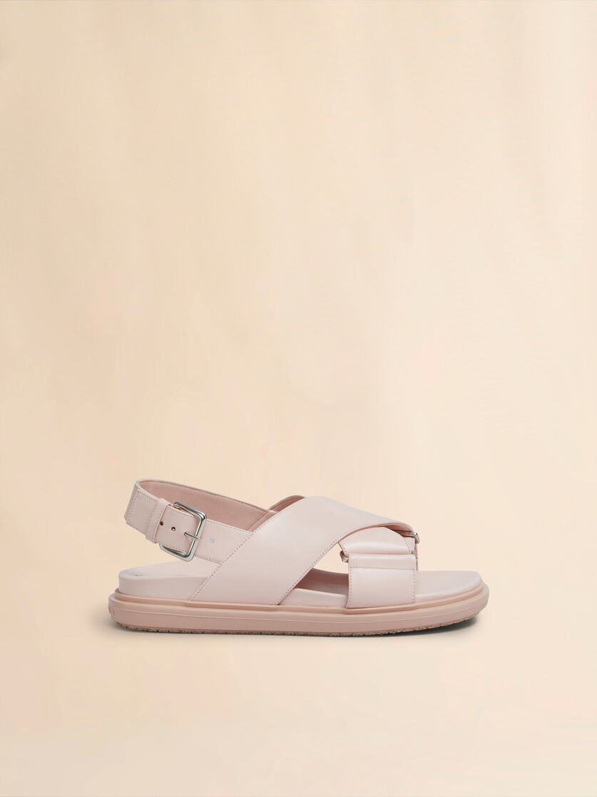 Sandal íocónach tras-chrosach Fussbett déanta as leathar lao réidh, a dhaingnítear le strap búcla inchoigeartaithe. Dearadh aon-dhathach le boinn istigh leathair tonúil agus bonn seachtrach rubair. Litriú Marni ardaithe ar an tsáil.