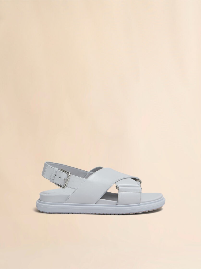 Sandal íocónach tras-chrosach Fussbett déanta as leathar lao réidh, dúnta le strap búcla inchoigeartaithe. Dearadh aon-dhathach le boinn istigh leathair tonúil agus bonn seachtrach rubair. Litriú Marni ardaithe ar an tsáil.