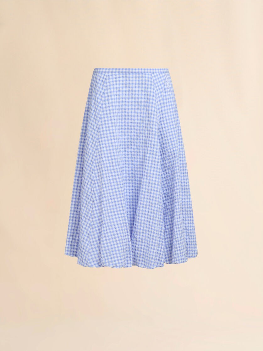 Sciorta midi dúbailte seersucker déanta as cadás teicniúil seiceáilte. Líneáilte, le scáthchruth leathnaithe agus zip ar chúl. Tá Siombail Marni bróidnithe de láimh ar an taobh.