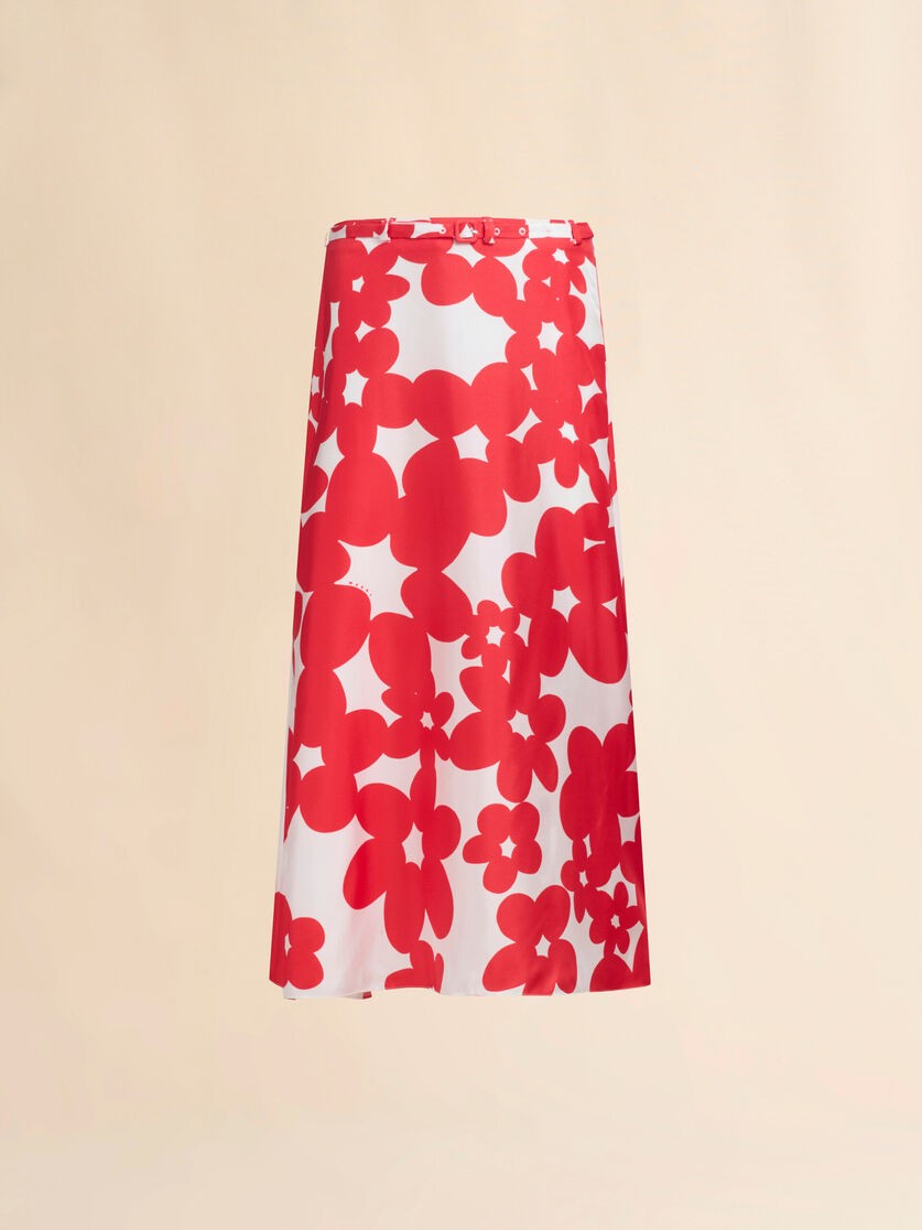 Sciorta midi leathnaithe gearrtha as twill síoda, le patrún bláthanna macra séasúrach Dillies priontáilte ar fud. Coim rialta le crios meaitseála inbhainte agus dúnadh zip taobh. Tá Siombail Marni bróidnithe de láimh ar an tosaigh.