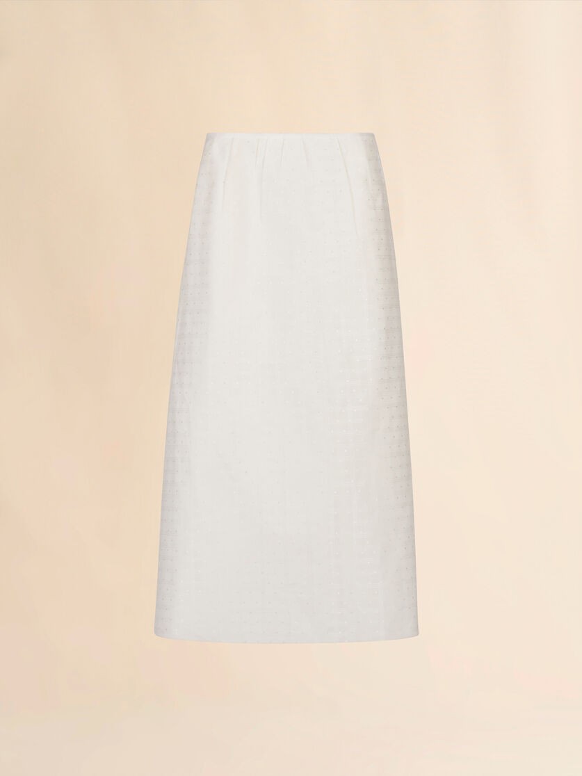 Sciorta fada A-líne déanta as toile cadáis. Dearadh jacquard mín, ina bhfuil patrún seiceála agus poncanna polka. Struchtúrtha le dartanna neamhrialta timpeall an choim. Dúnadh zip dofheicthe ar chúl.