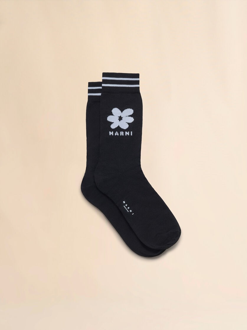 Stocaí lár-lao déanta as meascán cadáis shínte. Mionsonraí bláthanna Pop Fields i ndath codarsnach. Cufaí leaisteacha le stríoca agus scríbhneoireacht jacquard Marni.