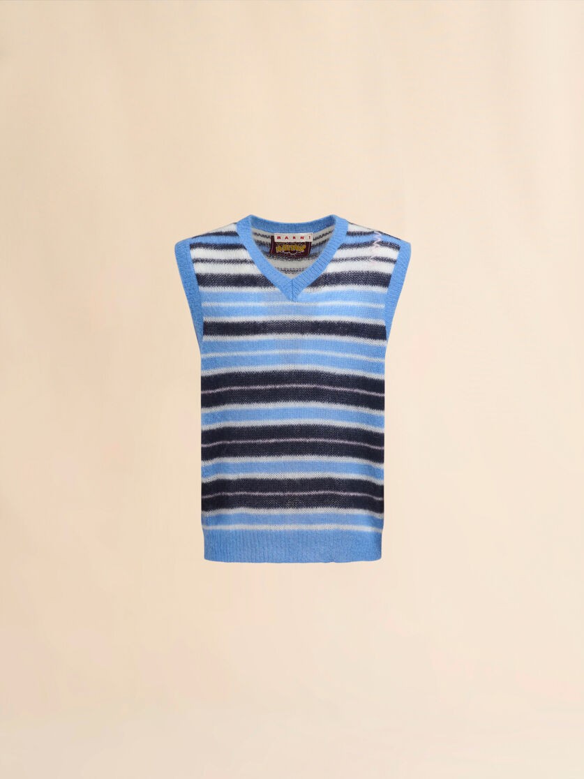 Veist muineál V déanta as mohair scuabtha éadrom le patrún stríocach. Feistiú rialta agus imeallacha ribíneach daite soildathacha. Maisithe le Siombail Marni bróidnithe de láimh ar an ngualainn.