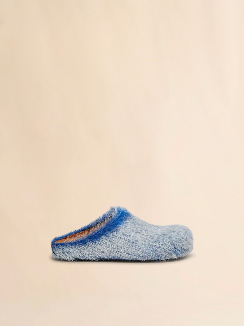 Indigo Long Hair Calfskin Fussbett Sabot Blue Lilac