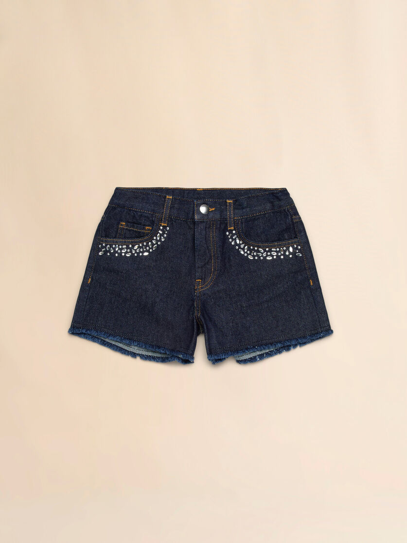 Short pants in dark denim. Rhinestones applied along the front pockets. Color contrast stitching. Frayed hems at the bottom.