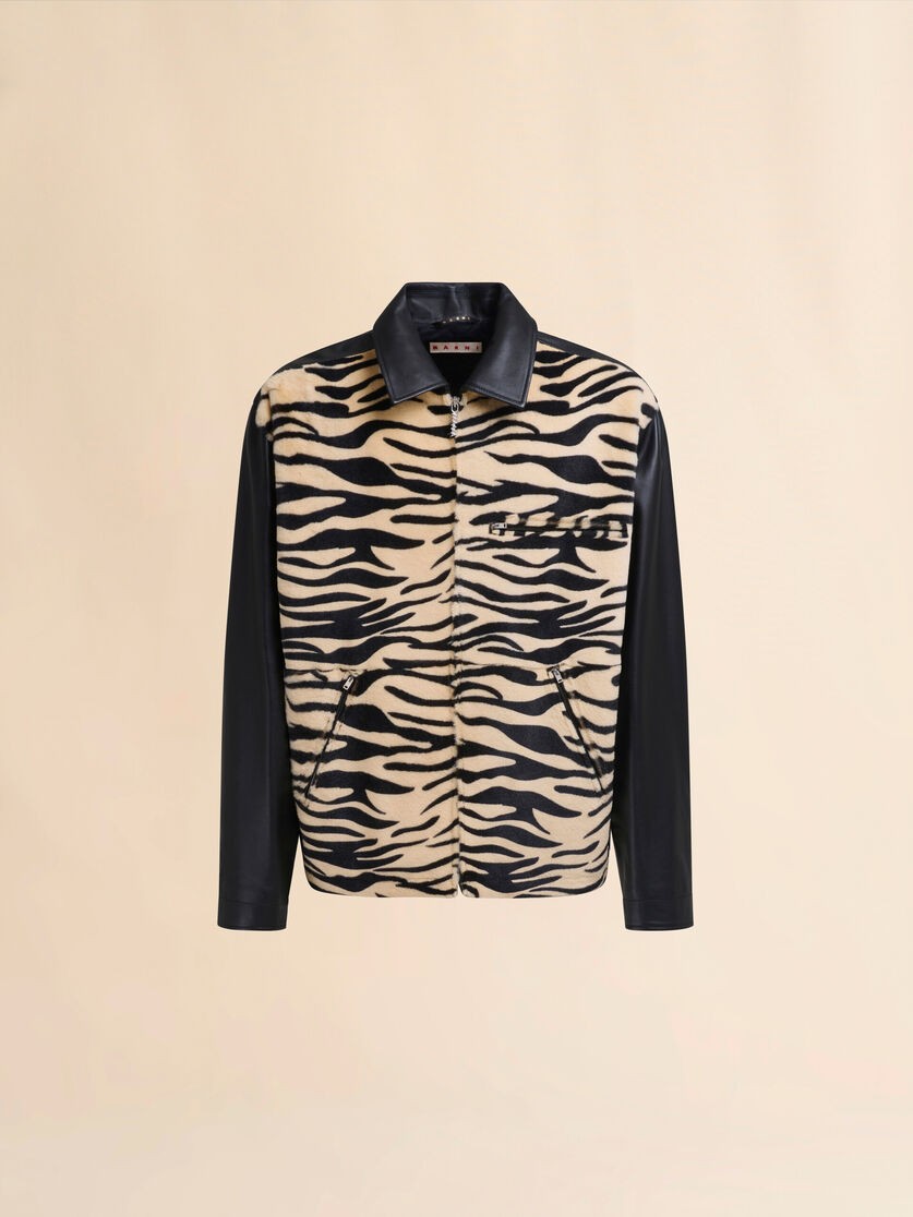 Padded jacket made of buttery soft nappa. Front in tiger print shearling. Relaxed fit with shirt collar, side pockets and zipped chest pocket. Zip closure. Finished with a leather label with embossed Marni logo on the back.