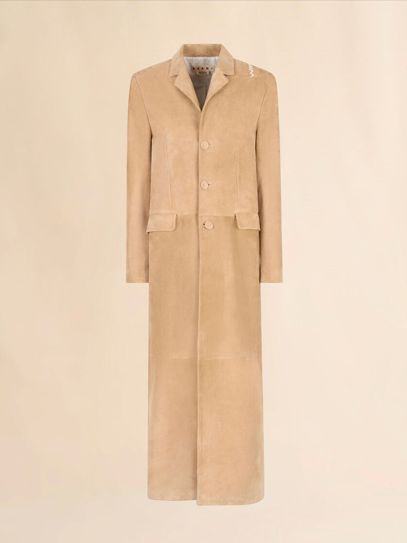 Longline duster coat made from supple full-grain suede leather with a silky, lightweight feel. Straight cut with front button closure and flap pockets. Lined. Hand-stitched Marni Symbol on the shoulder.