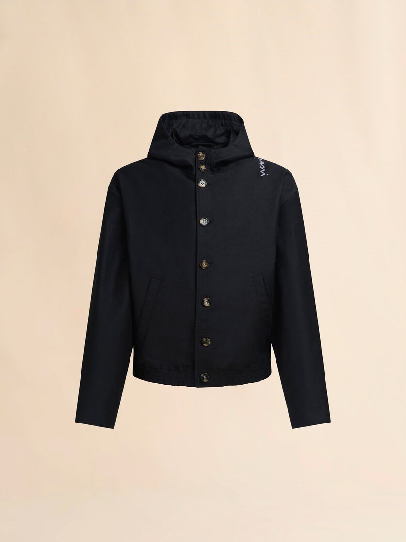 Hooded jacket, made of compact organic cotton gabardine. Slanted side pockets, dropped shoulders and elasticated hem. Lined. Button closure. Finished with hand embroidered Marni Symbol on the shoulder.