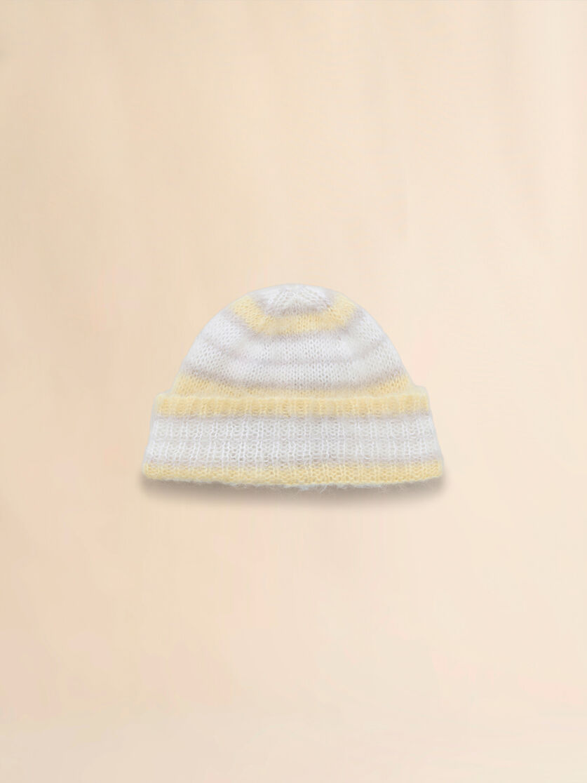 Beanie made from soft brushed mohair. Stripe pattern and ribbed turn-up.
