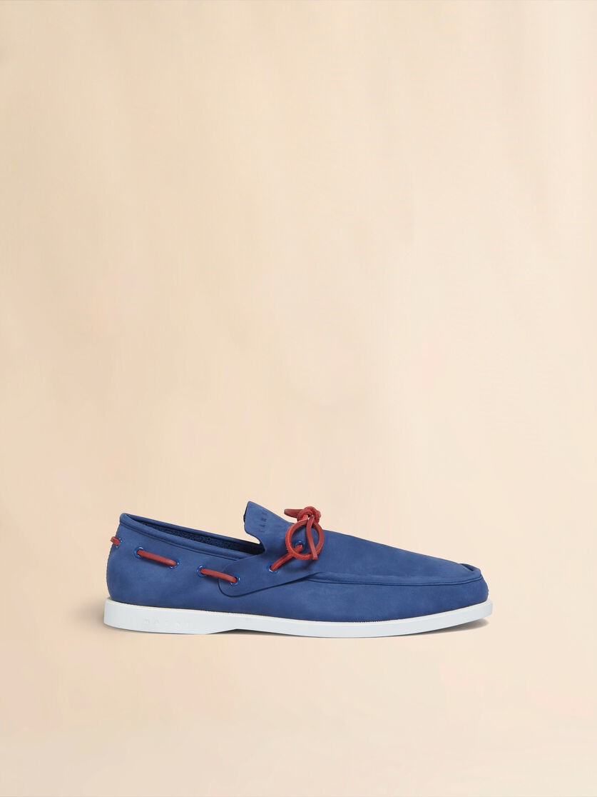 Boat loafer made of unlined nubuck. Deconstructed design with leather laces and a white rubber sole featuring a side logo. Finished with an embossed Marni logo on the tongue.