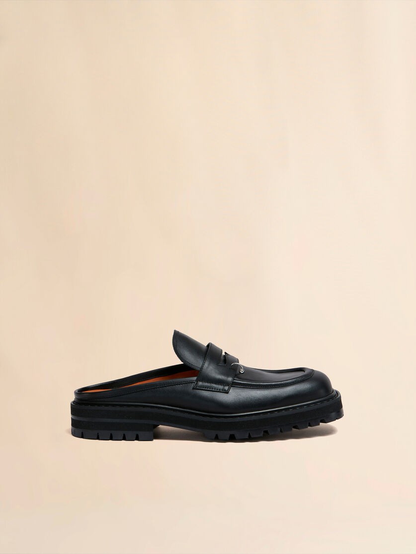 Smooth calfskin leather sabot. Penny loafer style. Metal piercing detail on the saddle strap. Leather insole. Chunky rubber lug sole.