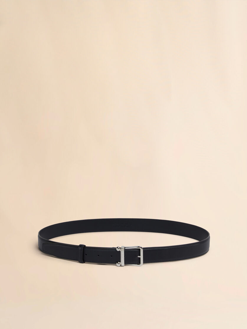 Slim belt crafted from calfskin leather. Metal buckle inspired by iconic Trunkaroo clasp, engraved with Marni lettering.