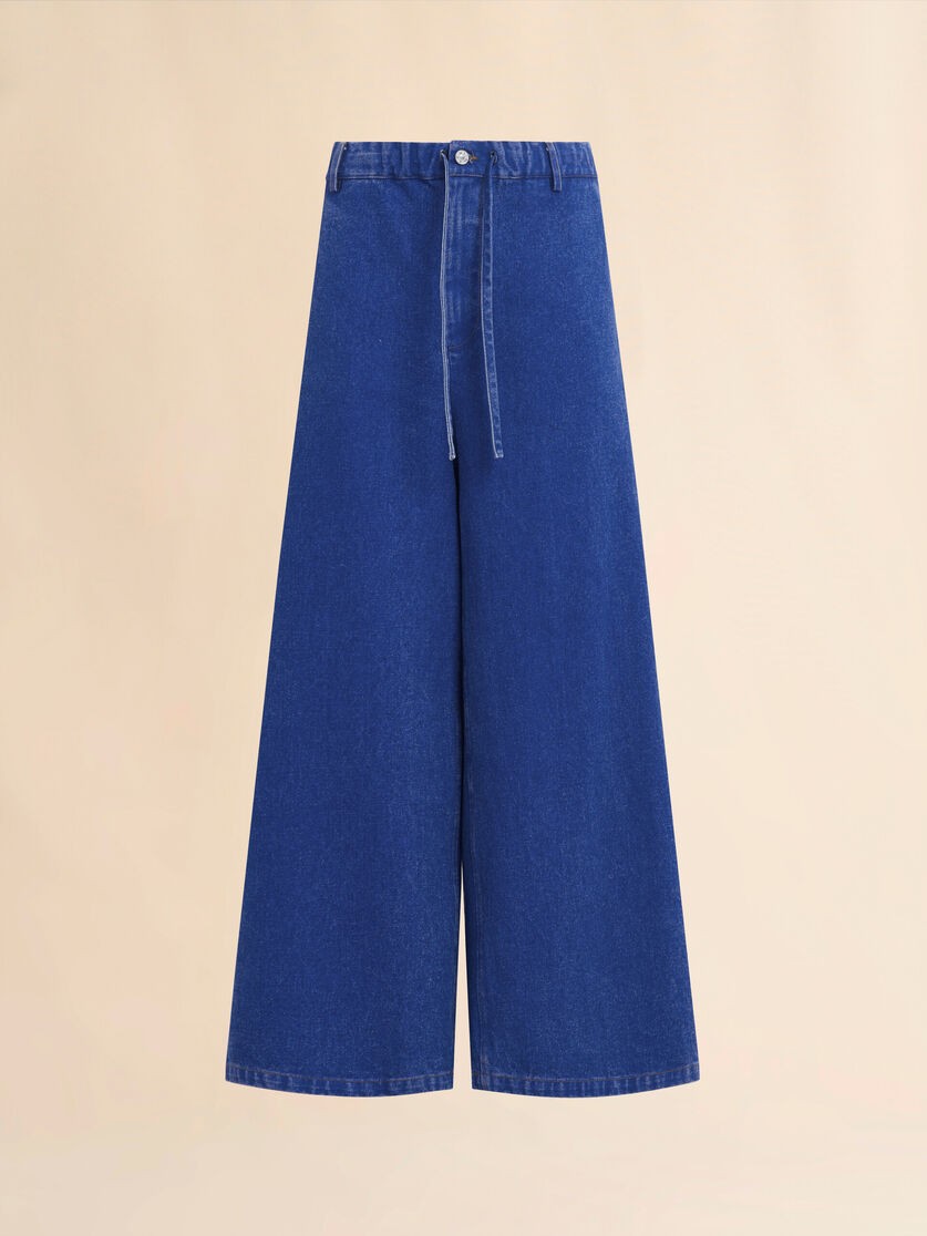 Bleached organic denim jeans. Relaxed fit and low elasticated drawstring waist. Welt pockets on the back. Zip and tack button closure.