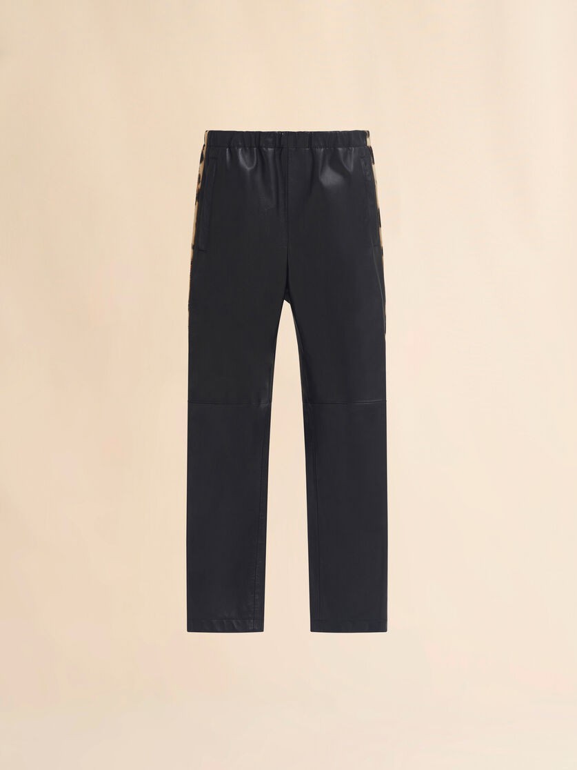 Jogging style trousers made from soft nappa leather. Loose leg with an elasticated waist. Back pocket. Featuring side bands in shaved shearling with animalier print.