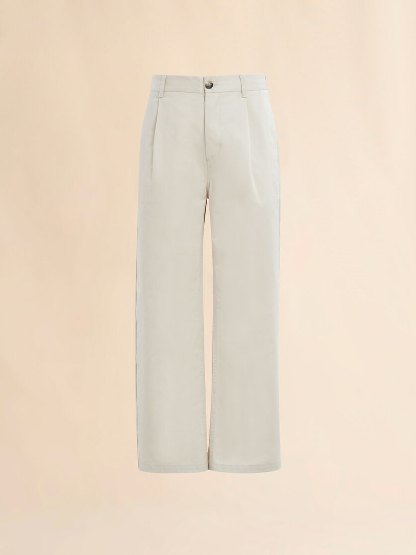 Organic cotton gabardine straight leg trouser. Regular fit with front pleats. Side pockets and welt pockets on the back. Zip and horn button closure.