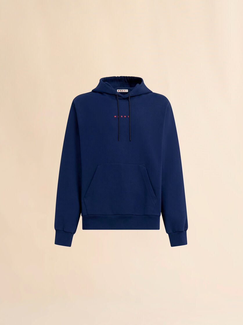 Loopback organic cotton jersey hoodie. Regular fit with ribbed trims and kangaroo pocket, embellished with a small Marni print on the chest.