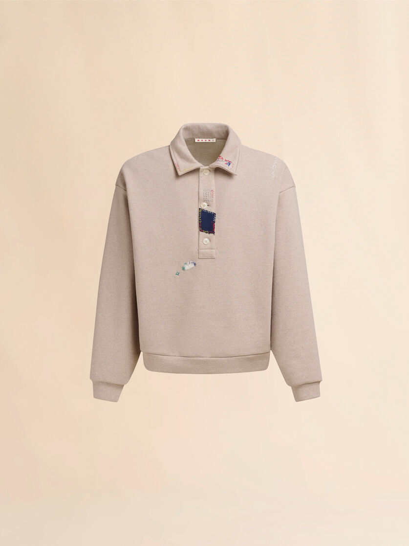 Long-sleeved polo sweatshirt made of organic jersey cotton. Boxy fit with dropped shoulders. Button up polo collar. Embellished with a hand embroidered Marni Symbol on the shoulder and patch details.