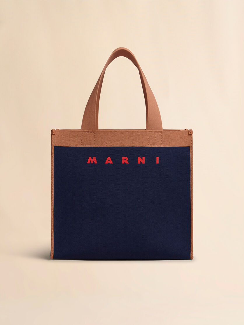 Shopping bag in knitted fabric. Medium size. Colourblock design with signature Marni logo on the front. Carried in the hand. Detachable vegan leather zipped pouch.