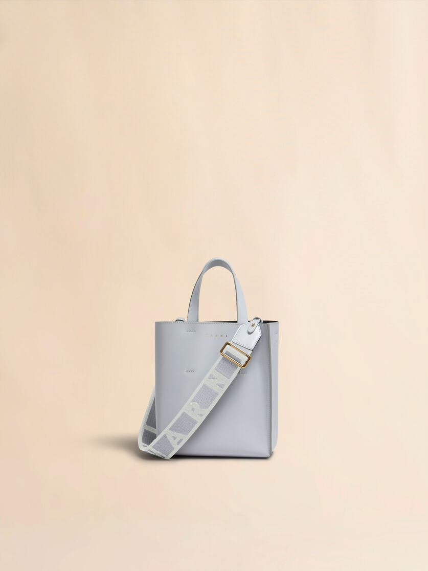 North/South tote bag, mini size, in calf leather with internal slot pocket. Fabric drawstring bag inside. Leather top handles and detachable shoulder strap, adjustable with buckle. Colorblocked design. Gold hardware. Gold printed logo outside.