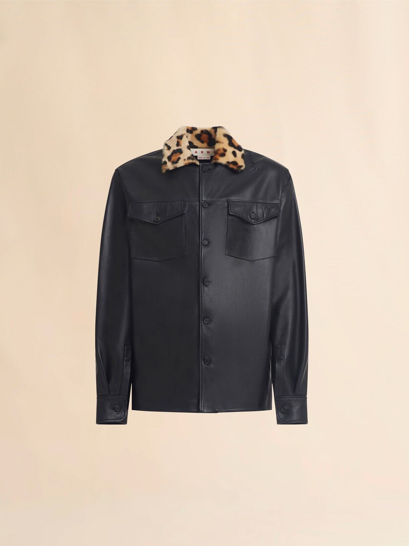 Long-sleeved shirt made from smooth and supple nappa leather. Contrasting shaved shearling collar with animalier print. Relaxed fit. Chest patch pockets with buttoned flaps. Buttoned cuffs and front closure. Finished with handcrafted Marni Mending embroidery on the shoulder.
