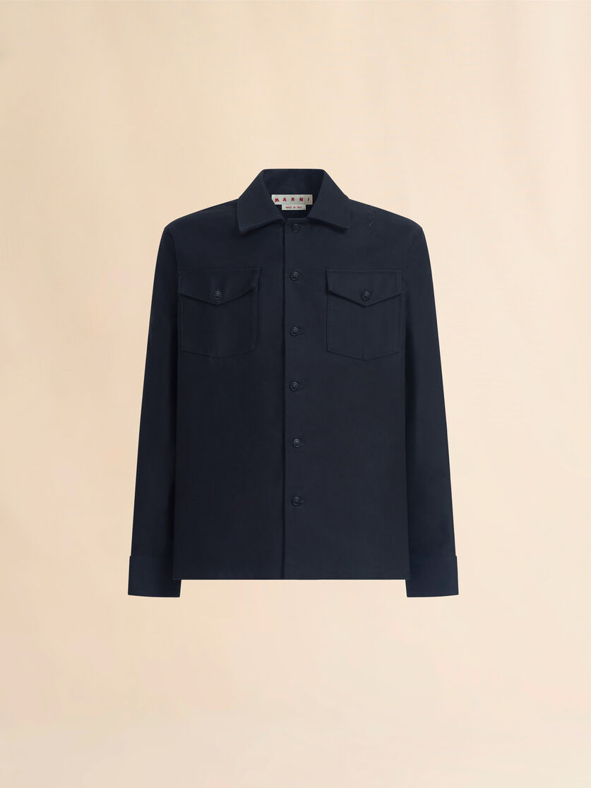 Long-sleeved shirt in organic cotton satin with a compact texture and velvety feel. Relaxed fit. Chest patch pockets with buttoned flap. Buttoned cuffs and front closure. Handcrafted Marni Mending embroidery on the shoulder.