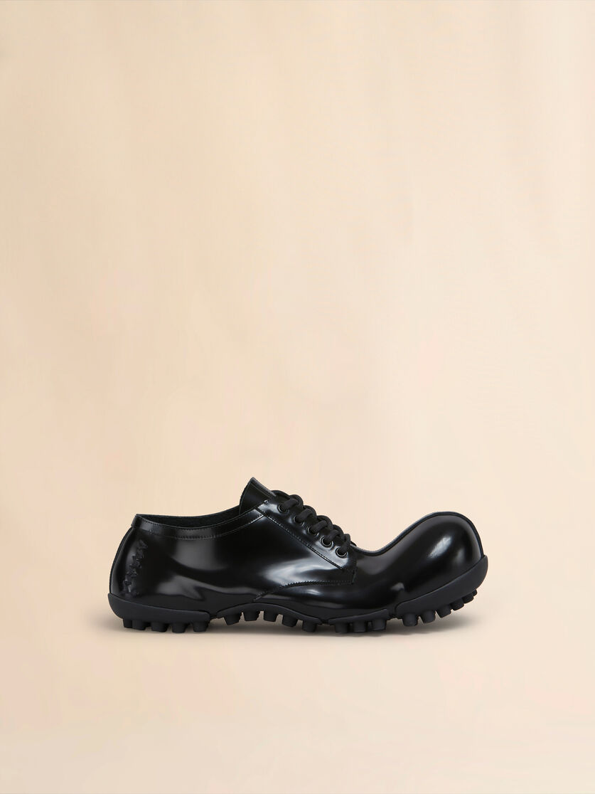Lace up Derby shoe made of buffed calfskin leather. The design features a bubble toe and a flexible rubber shoe with rubber studs. Tonal Marni Mending logo embossed on the heel.