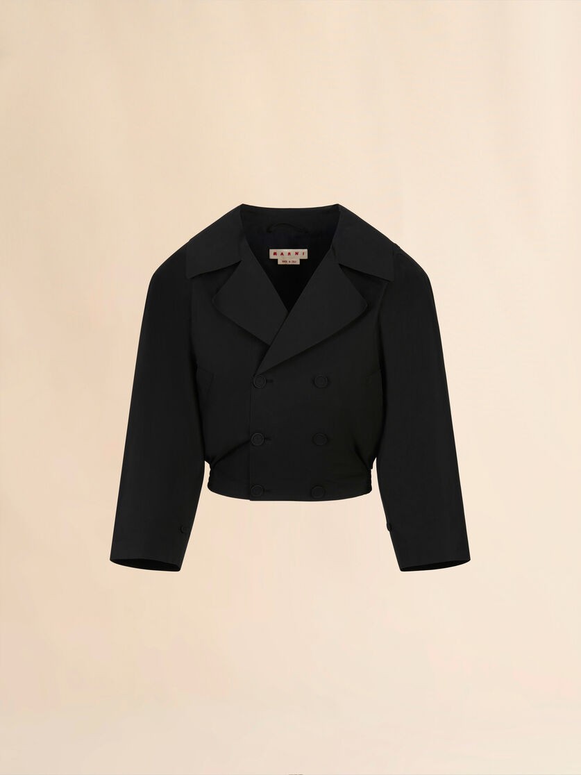 Double-breasted jacket made from organic cotton poplin with a compact feel. Bonded details. Boxy fit with raglan sleeves and notch lapels. Covered buttons. Front welt pockets. Lined. Hand-stitched Marni Mending on the left shoulder.