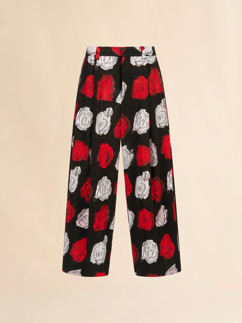 Formal wide-leg trousers made from cotton poplin with a compact, heavy feel. Printed with this season's Mercury white and red rose motif, created using a special scraping technique on wet paint. Styled with voluptuous front pleats. Relaxed mid-rise fit. Concealed zip and hook closure. Side pockets and back welt pockets.