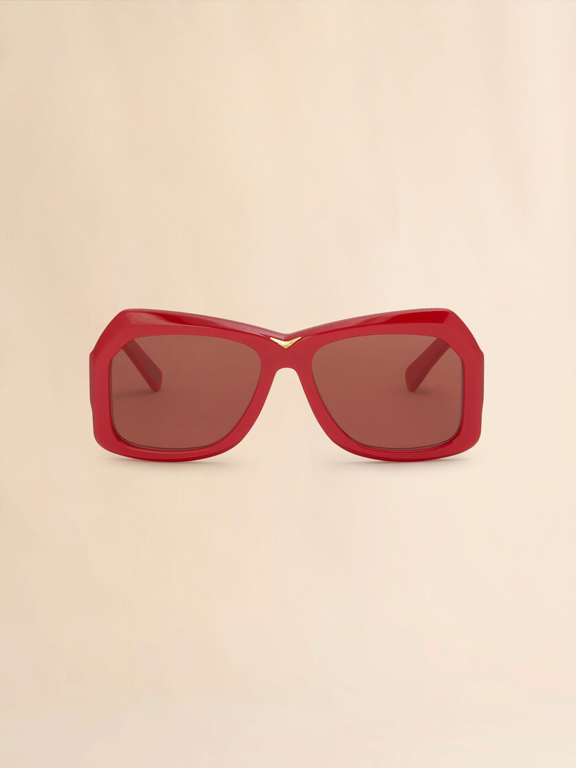 Tiznit sunglasses crafted from thick acetate. Statement silhouette with oversized lenses. Geometric design, styled with faceted rims and curved lenses. Detailed with Marni lettering on the temple.