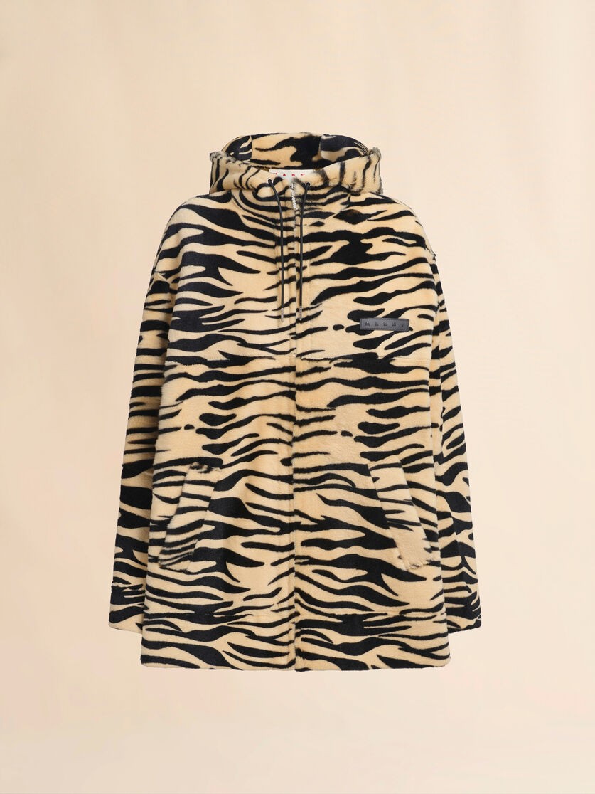 Longline drawstring shearling hoodie with all-over tiger print. Unlined, with a relaxed fit, side pockets, and full front zip. Finished with a leather label with embossed Marni logo on the chest.