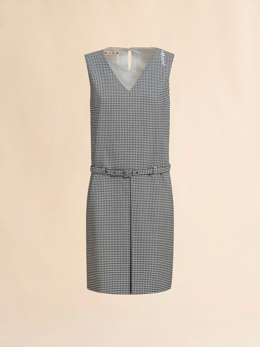 Sleeveless, wool blend checked dress with a V-neck, and front slit in the mid length skirt. Tonal belt and button up teardrop opening at the back of the neck. The distinctive Marni Symbol is hand embroidered on the left shoulder.