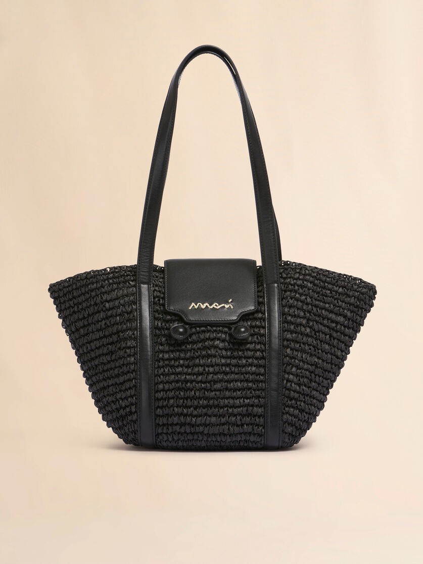 Trunkaroo beach tote made from woven raffia-effect fabric. Small size. Leather handles and leather flap with hand-stitched Marni Symbol.
