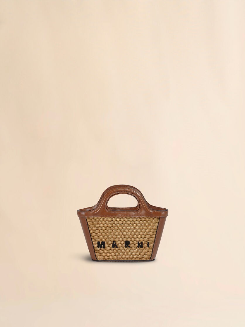 Tropicalia Micro Bag crafted from leather and raffia-effect fabric panels. Can be carried by hand or worn crossbody. Leather closure. Handles with raised effect. Leather bottom and removable shoulder strap. Golden metal details. Embroidered logo on the front.