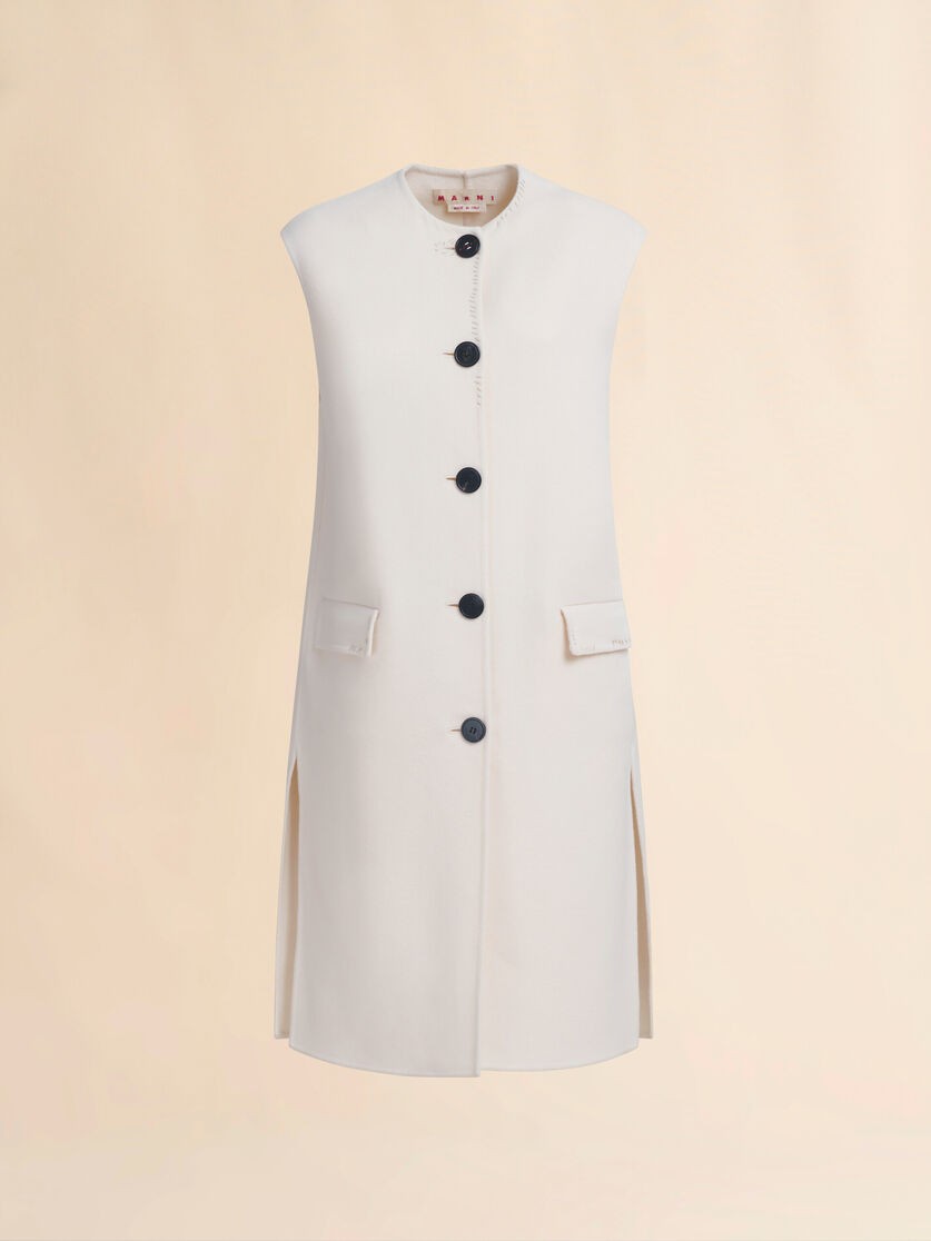 Longline sleeveless felt jacket, made from a double-face virgin wool and cashmere blend. Straight fit with dropped shoulders, side slits and round neck. Flap pockets and oversized buttons. Hand-embellished with Marni mending stitching and logo.