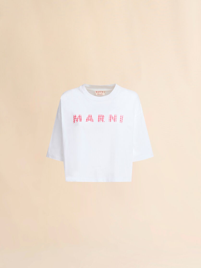 Short sleeved jersey cotton T-shirt with a boxy, cropped cut. A checked Marni Scribbled logo is printed on the front.