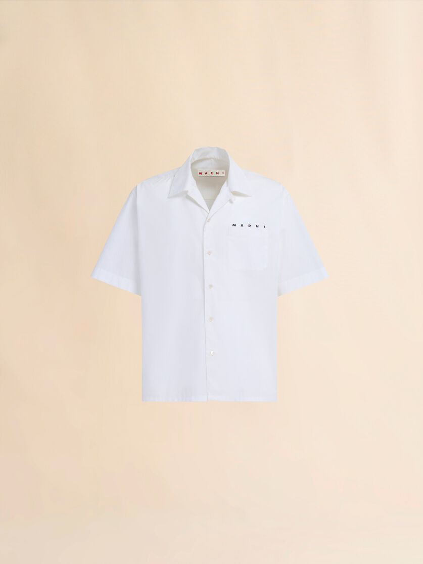 Short-sleeved bowling shirt made from organic cotton poplin. Detailed with a Marni logo poking out from behind the chest pocket. Boxy fit with straight-cut hem and mother-of-pearl button closure. Can be worn with a bowling collar or fully buttoned up.