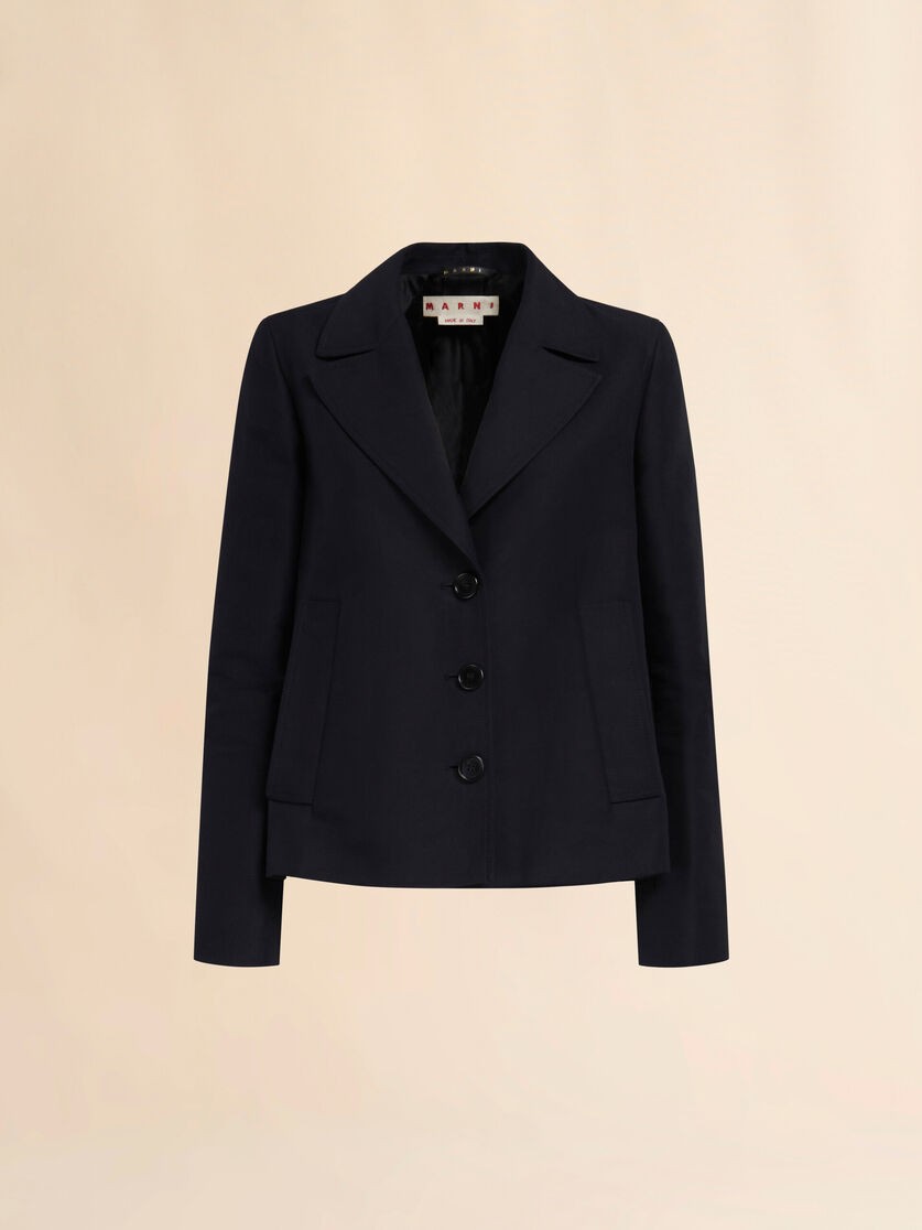 Cropped single-breasted jacket crafted from cotton cady. Voluminous A-line silhouette with lapels and rear inverted pleat, fastening with a triple-button closure. Finished with front welt pockets. Lined.