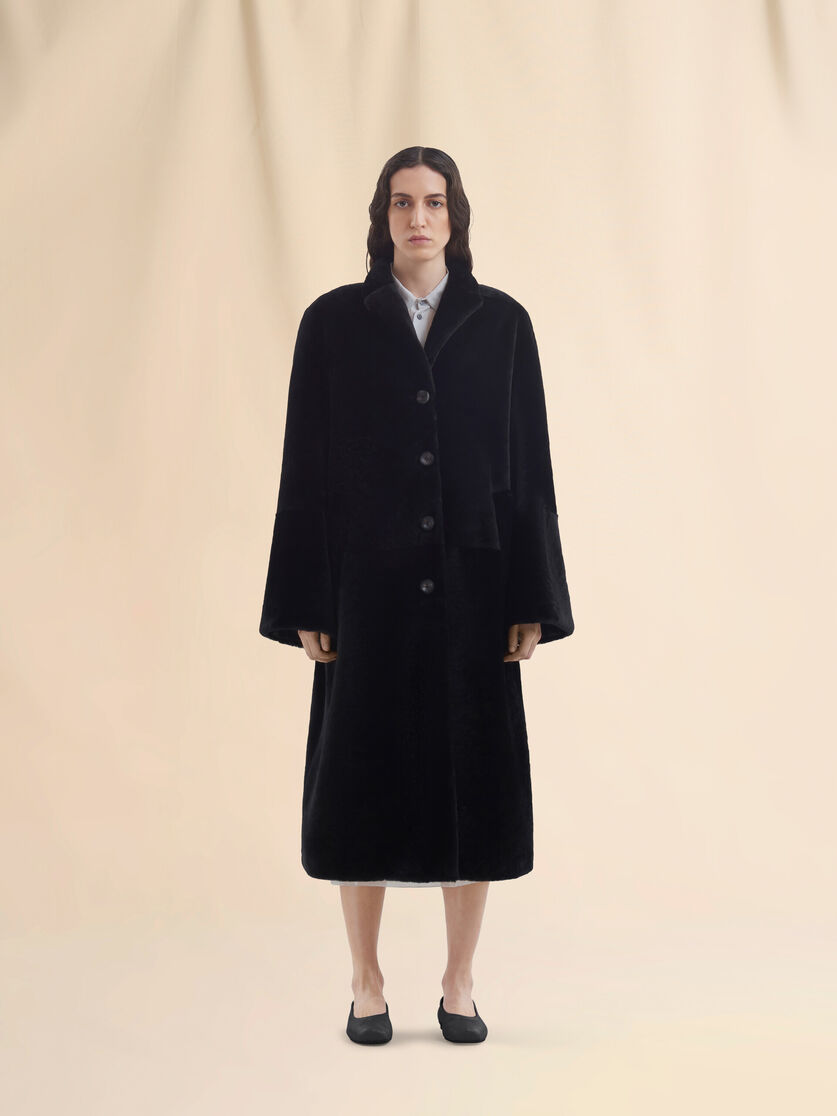 Longline coat crafted from merino shearling with a plush shaved finish. Oversized fit with straight-cut padded shoulders and raglan sleeves. Button closure. Nappa leather interior.
