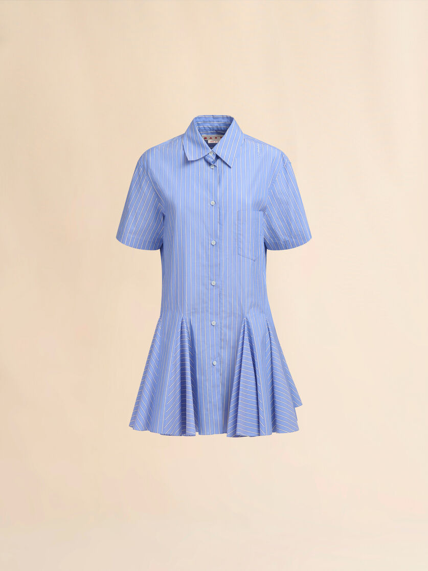 Short shirt dress cut from yarn dyed cotton poplin with a regimental pin stripe all over. The regular fit features a shirt collar, short sleeves and a flared skirt with godet front. Button up front with applied breast pocket and Marni Symbol hand embroidered on the left shoulder.