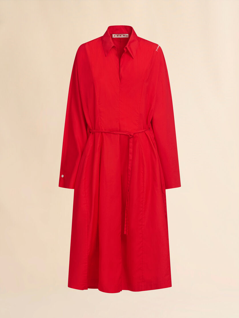 Midi shirt dress cut from organic cotton poplin. The relaxed fit has a shirt collar, long sleeves whit side buttons, a V-neck and adjustable tonal fabric belt. The distinctive Marni Symbol is hand embroidered on the front.