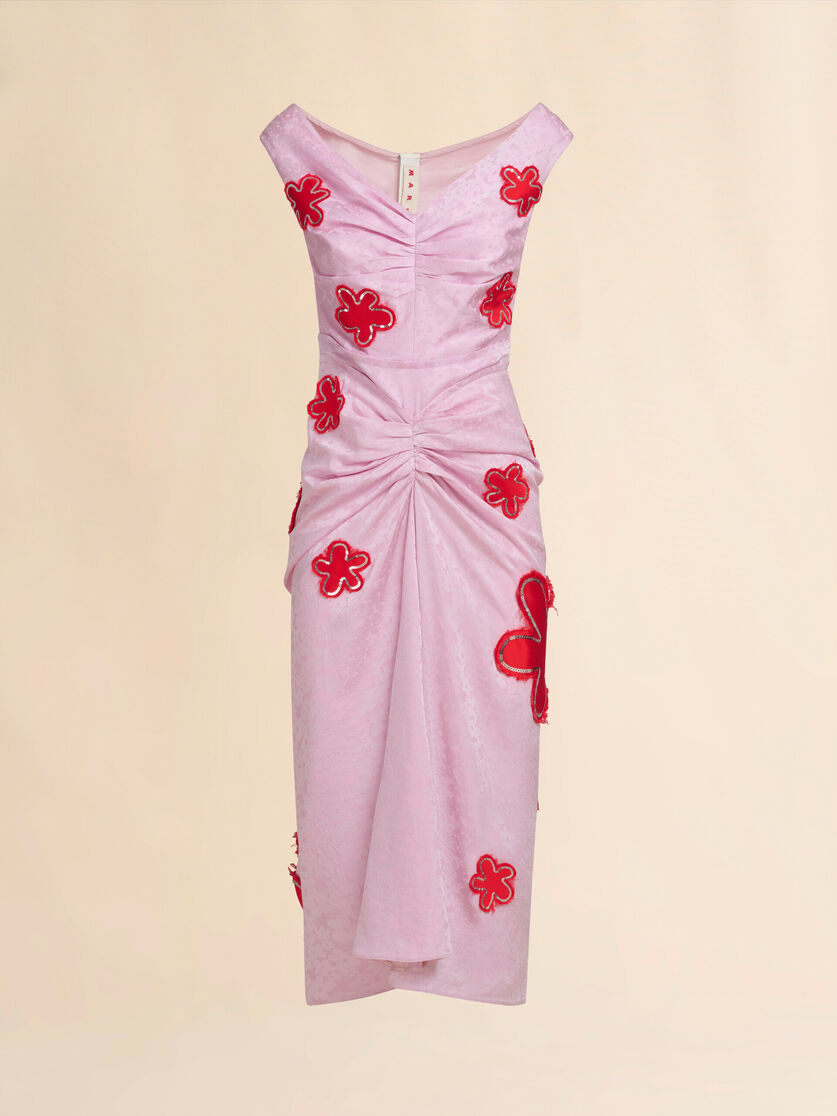 Pink Silk Jaquard Dress With Flower Patches And Sequins Pinkgummy