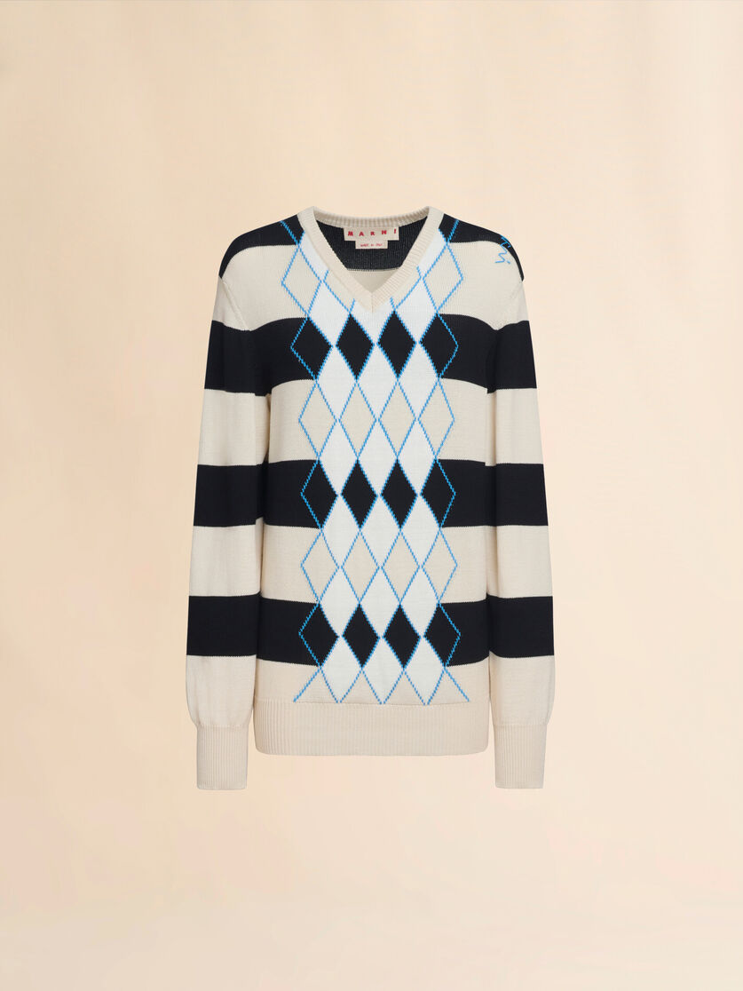 Cotton knitted sweated with a classic argyle motif on the front. The regular silhouette has long sleeves, a V neckline. Ribbed knit trims and a Marni Symbol hand embroidered on the left shoulder.
