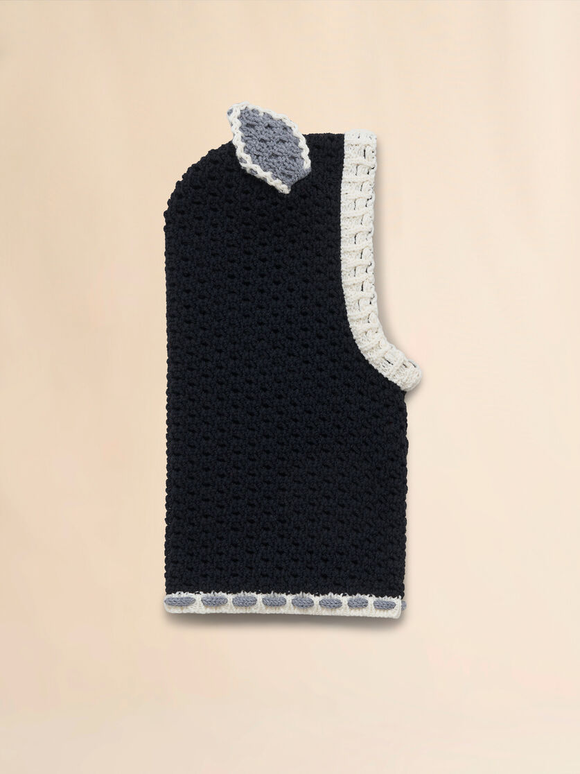 Colour block crochet wool balaclava with contrasting trim and playful donkey ears.