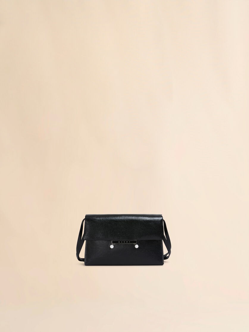 Medium Envelope bag made from patent leather with a tactile craquelé effect. Semi-rigid construction with two inside compartments. Open pocket in the front one, zip pocket in the back. Adjustable buckled shoulder strap: can be worn as a shoulder bag or crossbody. Flap closure with enamelled Marni clasp. Luxurious sheepskin leather lining.