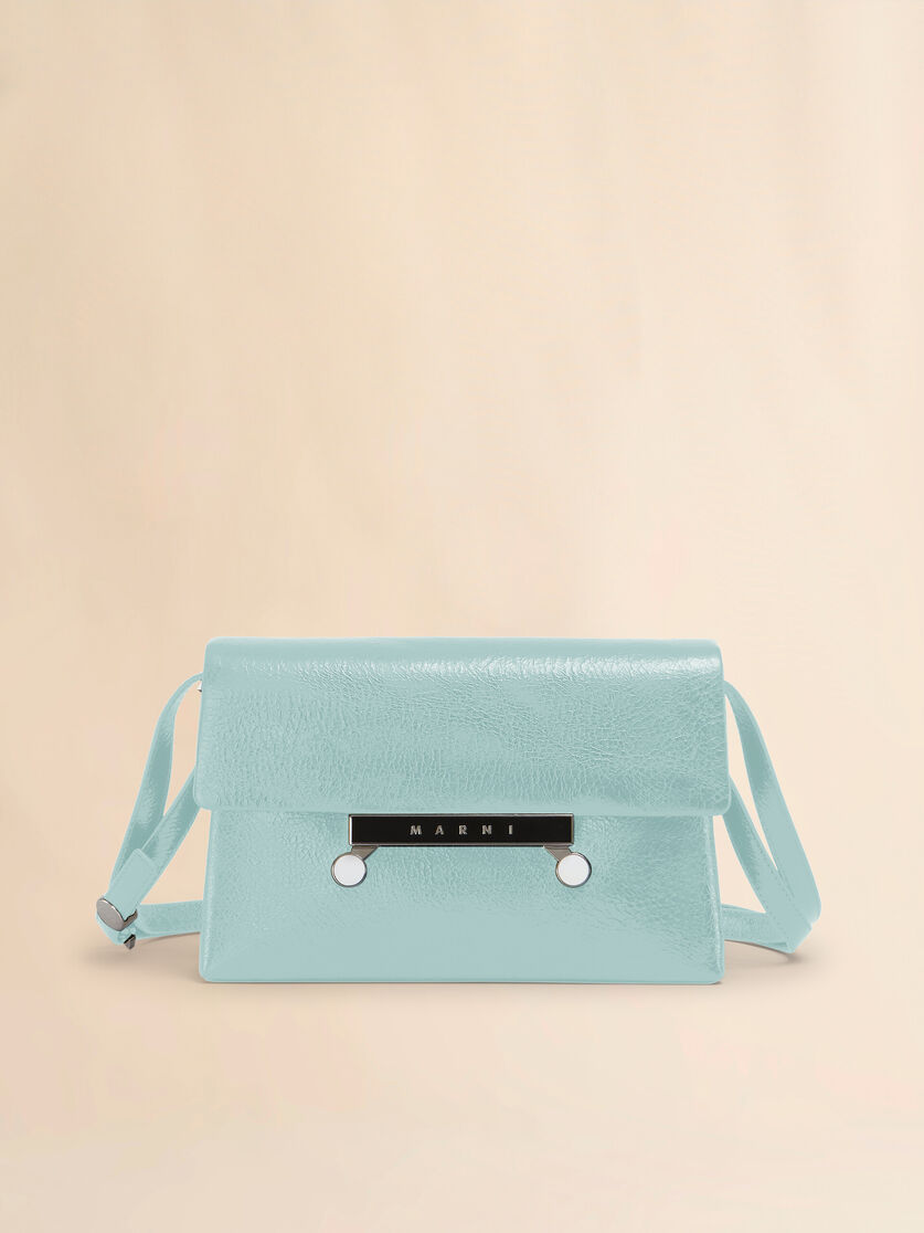 Small Envelope bag made from patent leather with a tactile craquelé effect. Semi-rigid construction with two inside compartments. Open pocket in the front one, zip pocket in the back. Adjustable buckled shoulder strap: can be worn as a shoulder bag or crossbody. Flap closure with enamelled Marni clasp. Luxurious sheepskin leather lining.